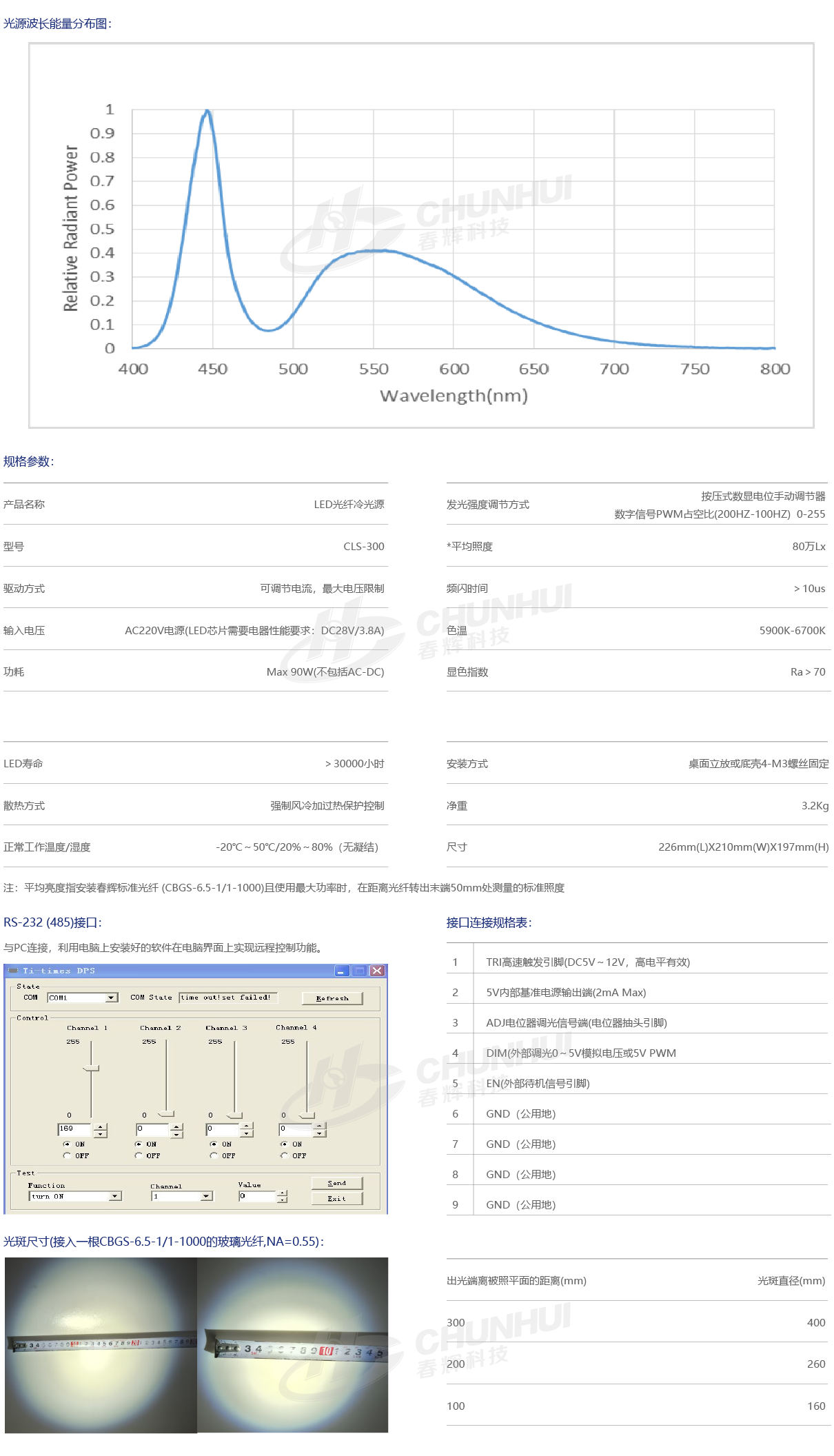 采用超大功率LED芯片,是一款高亮度的LED冷光源,實(shí)現超過(guò)300W金鹵燈光源的光輸出;支持快速觸發(fā)功能,響應時(shí)間5us,顯色指數70 / 90可選;重量輕,功率高,色溫高,顯色性好,能效高,性能穩定,噪聲小,壽命長(cháng),外型美觀(guān)、精巧,便于安裝,手動(dòng)調節或實(shí)行RS-232(D89)接口遠程控制,可聯(lián)機實(shí)現同步控制,可提供多種光纖輸出接口;廣泛用于醫療,光學(xué),工業(yè),科研等領(lǐng)域。